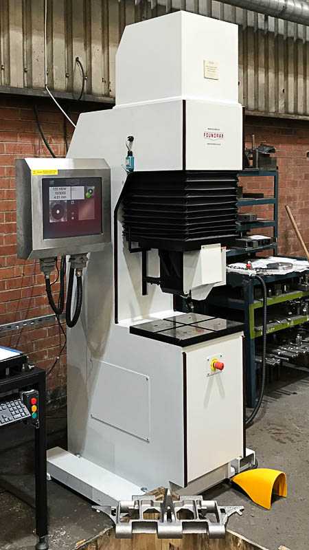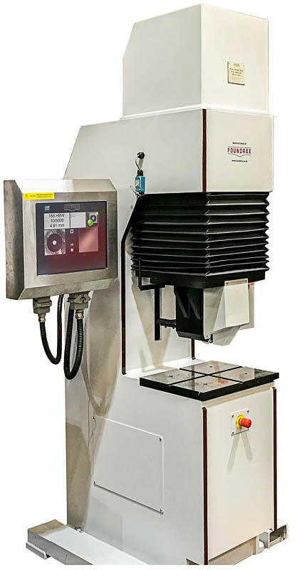 The automatic authentic optical Brinell measurement of the indentation is performed using an integral Foundrax BRINtronic fully automatic Brinell microscope which is fully networkable to allow for automatic downloading of batch parameters and uploading of results to the customer network if required.